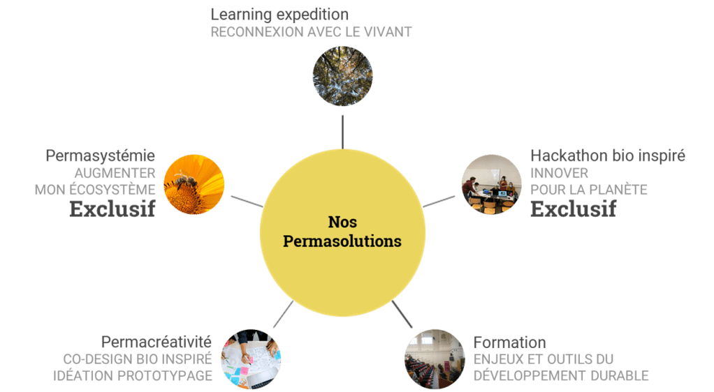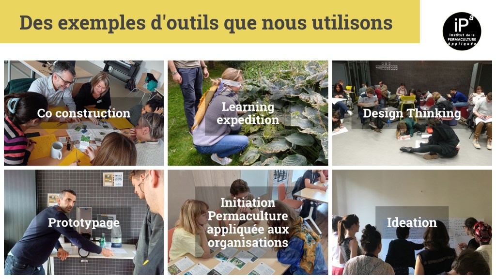 Nous utilisons la permaculture et ses principes issus du vivant, des outils de diagnostic, différentes méthodes de créativité, l’effectuation, le design thinking, en fonction des problématiques
